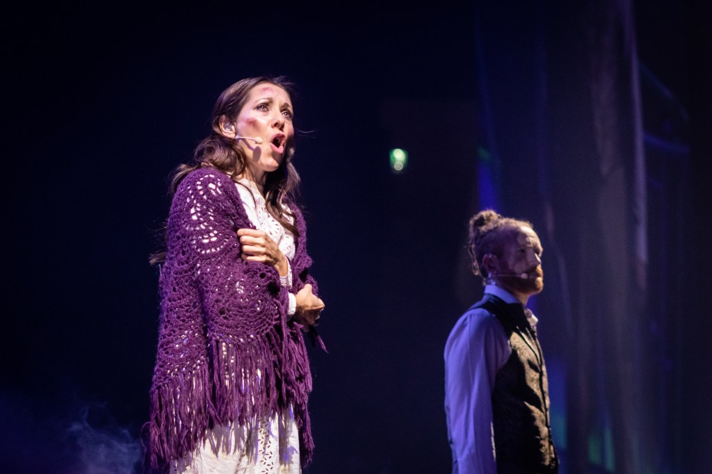 I found Adam Garcia as The Artilleryman a little bewildering at first, not that he didn’t embody the shell of a man gone to war with aliens, but that he didn’t in any way sound English at the first encounter. It wasn’t a major drawback because he really nailed it when he returned in the second act. His high note phrase – “We’ll start all over again!” – was perfect every time. Absolutely smashed it! His physicality was admirable too; he really worked to make his contribution immersive for the audience. Running through the crowd at first, and later summoning and scaling a bridge across the stalls added so much human energy to the overall performance.