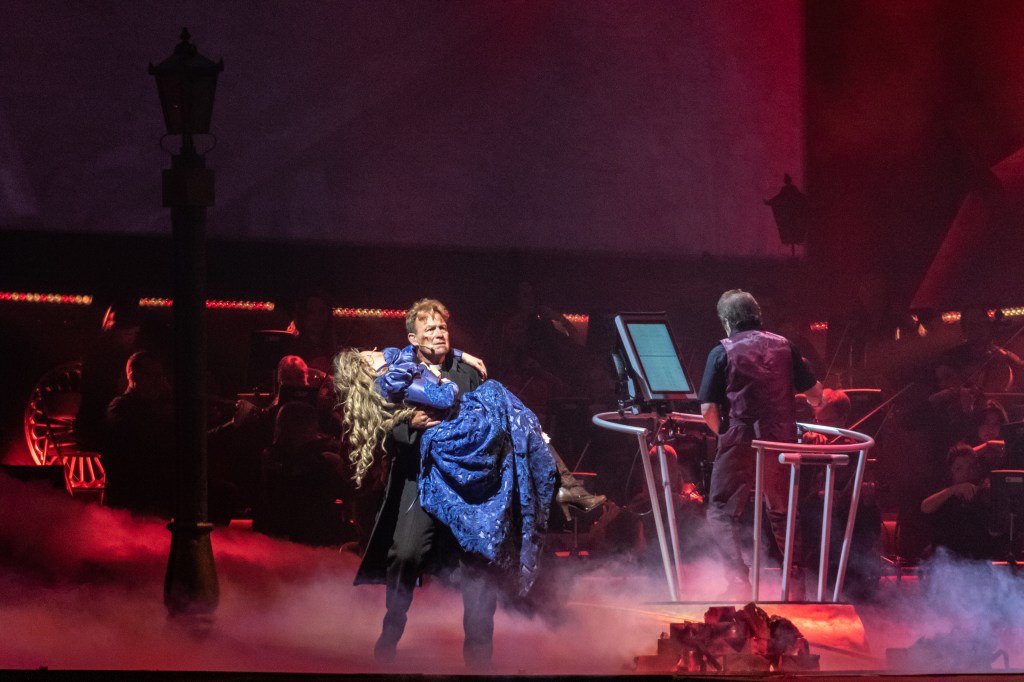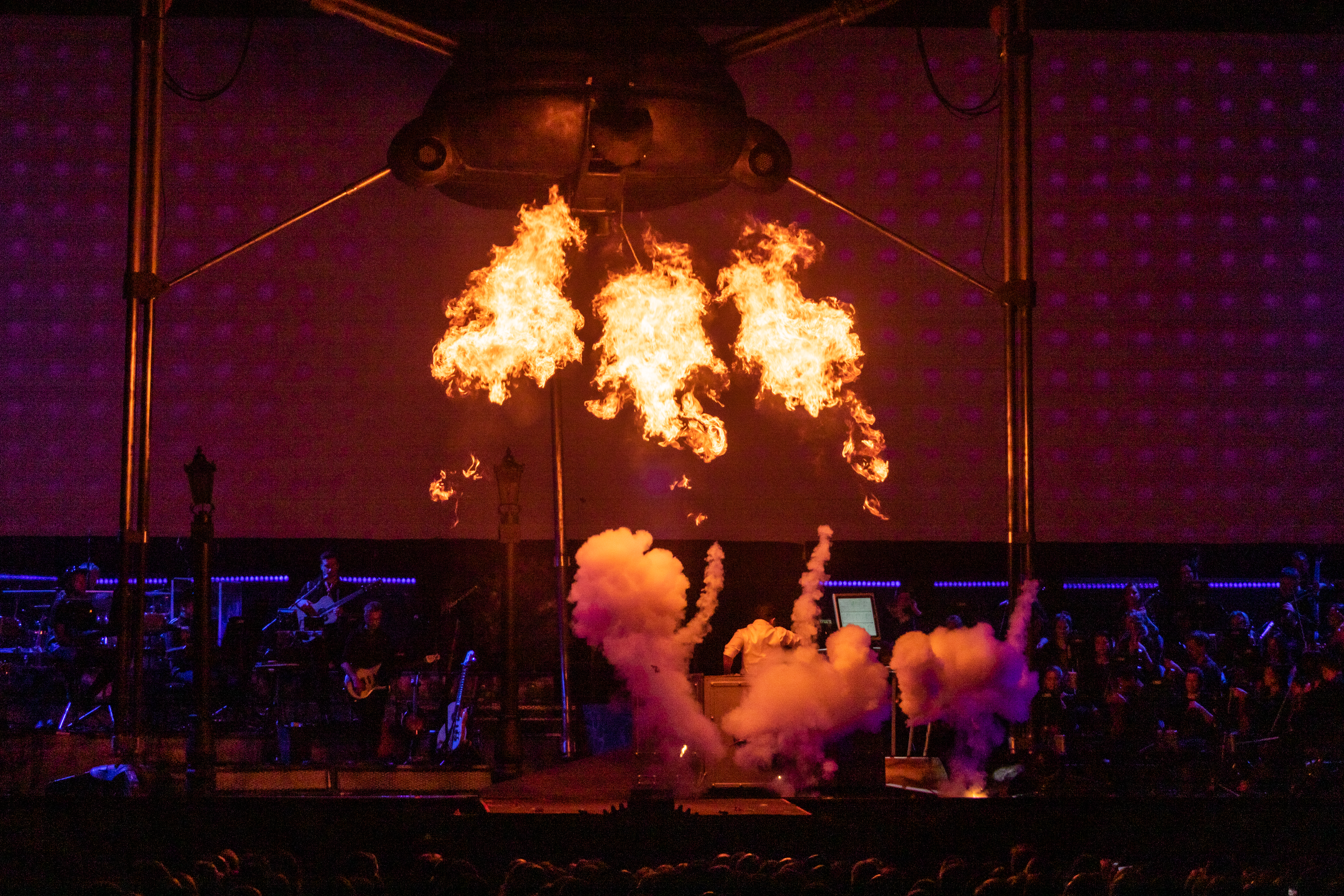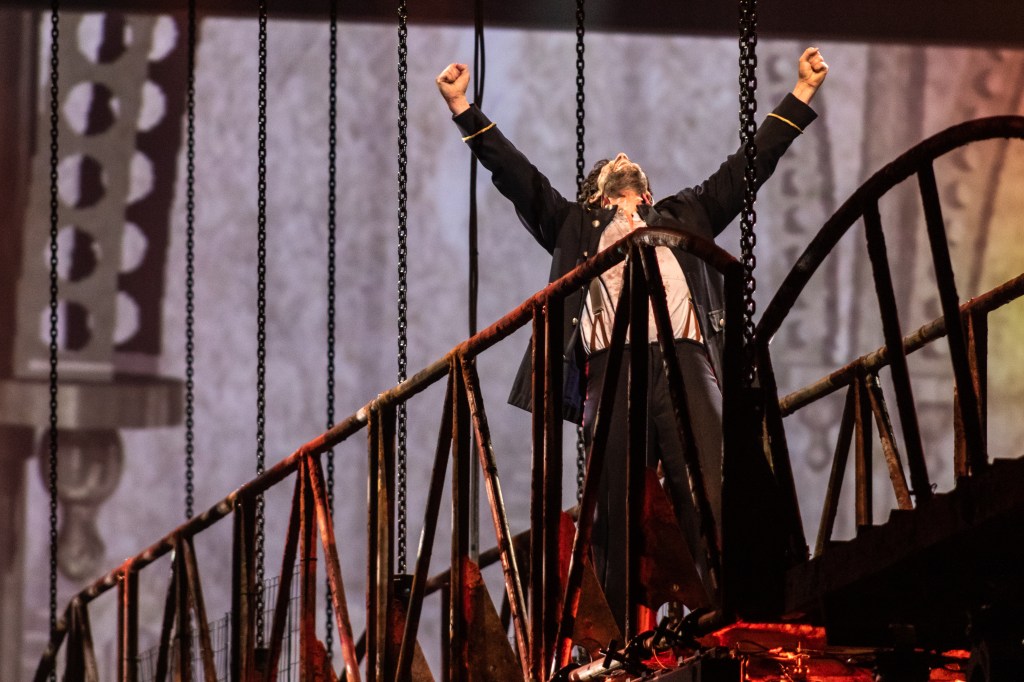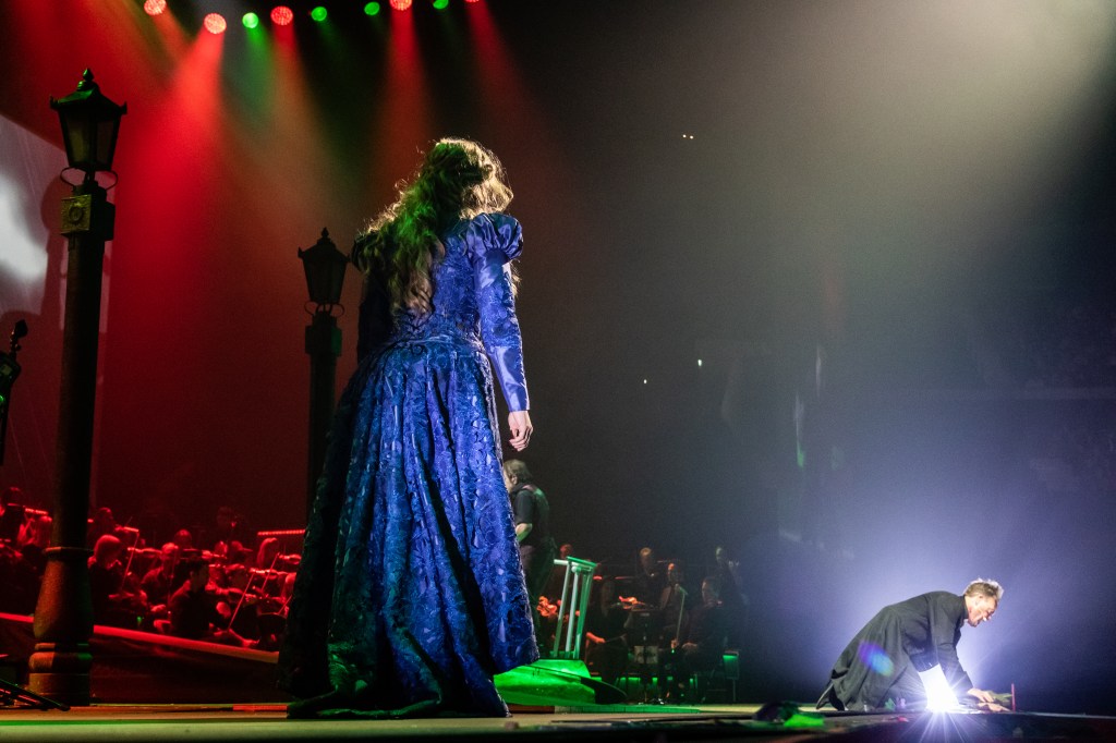 A ramp from the back of the stage running between two lamp posts lead the actors into position in front of the band, string orchestra and conductor, while a secondary stage in the centre of the arena was bare. However, as my eyes adjusted to the contrasting light from the large screens behind and on either side of the stage I began to see the finer details. Giant cogs, metal discs, scaffold railings, beams and pillars, adorned the stage surrounds with an industrial charm.